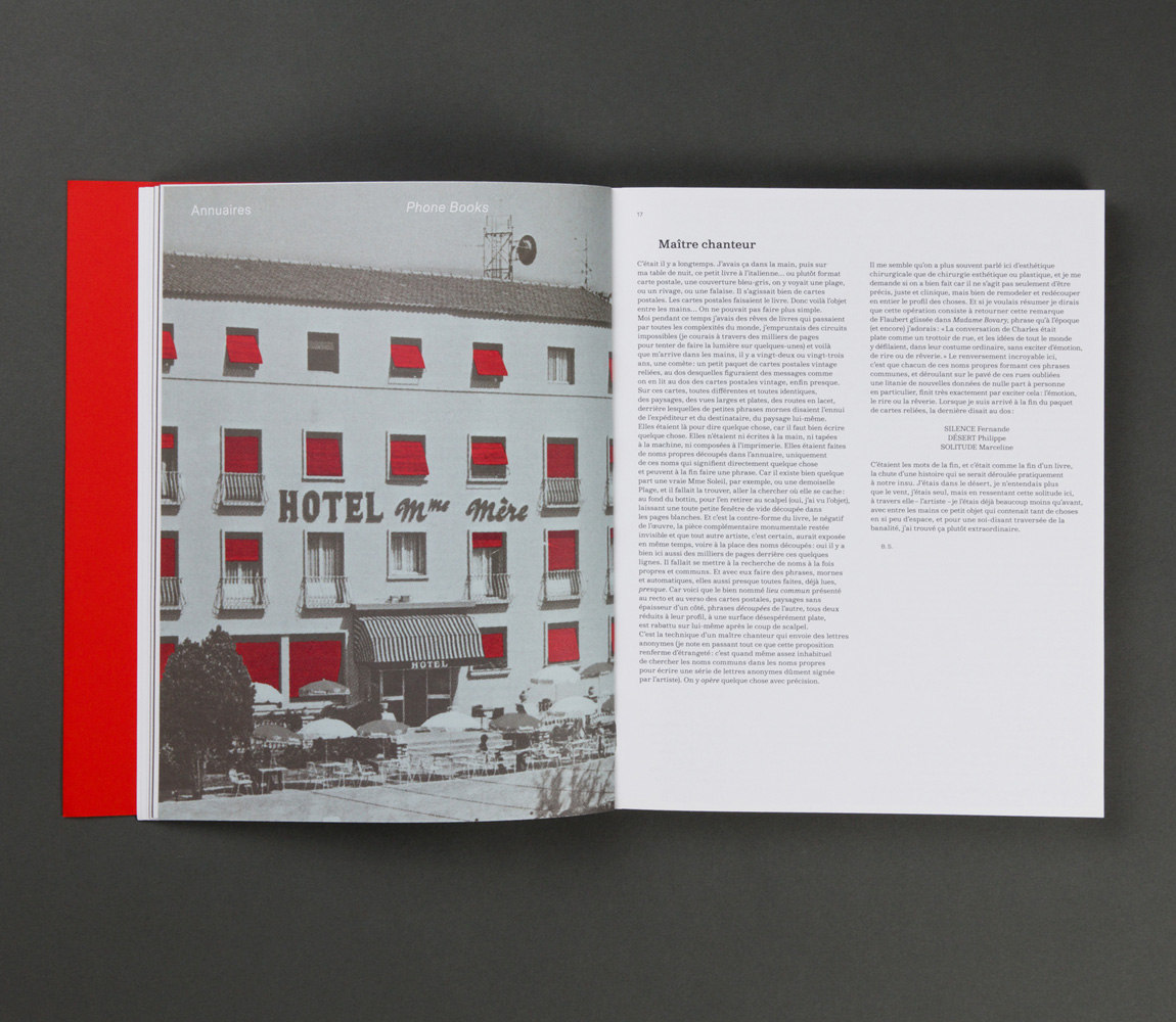 « Demander aux artistes de se présenter en quelques mots me semble bien souvent, en dépit de bonnes intentions, une mise à l’épreuve, un gage contre nature. Lorsque je me retrouve à devoir dire : mon travail parle de, je m’intéresse à ci ou ça, je ne perçois que trop le ridicule de la situation, l’absurdité qu’il y a à essayer de faire une visite guidée de soi-même. Dans ce domaine, on n’est jamais mieux servi que par les autres. De quoi cela parle ? Mais avant tout, de ce que vous voyez, ce que vous y voyez.